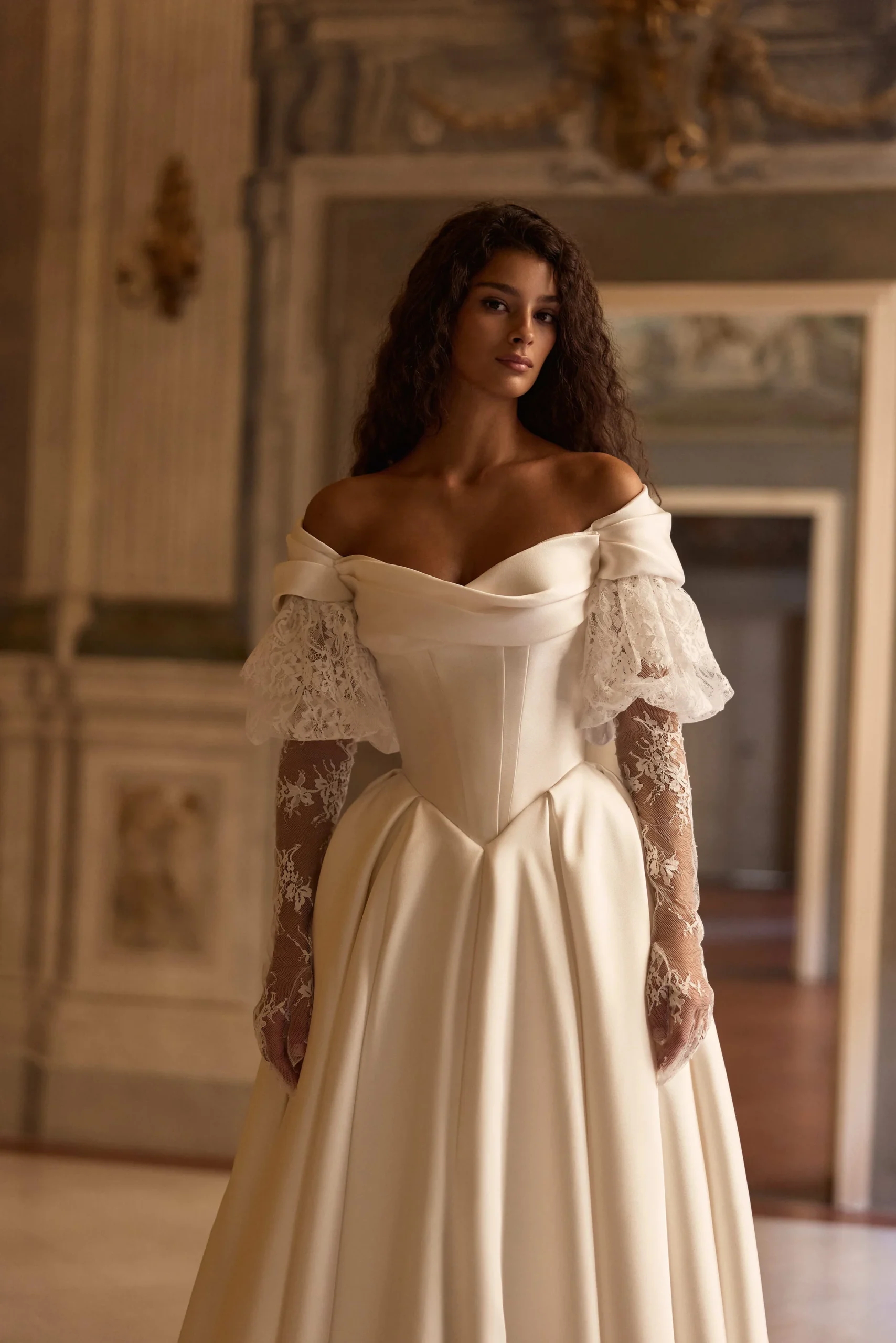 Princess gown with a draped, sculpted corset with a high back that defines the waist. Detachable off-the-shoulder sleeves allow for an effortless mid-celebration switch. The full flowing skirt is finished with decorative buttons down the back. Style with Darielle gloves for a gentle hint of romance within the regal aesthetic.
